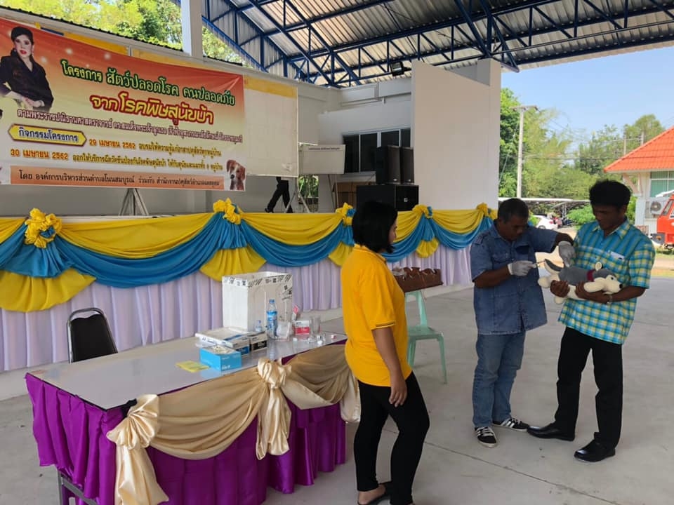 รายละเอียด : วันที่ 29-30 เมษายน 2562 อบต.โนนสมบูรณ์ร่วมกับสำนักงานปศุสัตว์อำเภอเดชอุดม จัดโครงการสัตว์ปลอดโรค คนปลอดภัย จากโรคพิษสุนัขบ้า ประจำปี 2562 โดยมีกิจกรรมอบรมให้ความรู้แก่อาสาปศุสัตว์หมู่บ้าน และออกบริการฉีดวัคซีนป้องกันโรคพิษสุนัขบ้าให้แก่สุนัขและแมวทุกหมู่บ้านในเขตพื้นที่ตำบลโนนสมบูรณ์