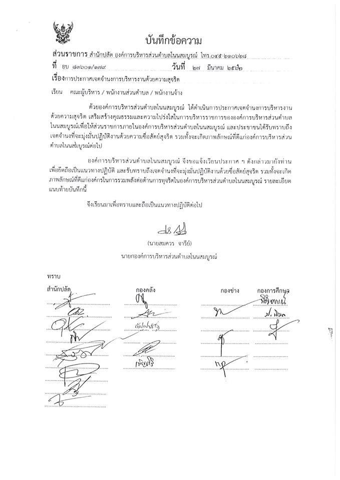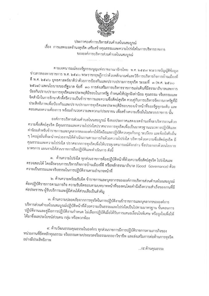 การประกาศเจตจำนงการบริหารงานด้วยความสุจริต ตามประกาศองค์การบริหารส่วนตำบลโนนสมบูรณ์ เรื่อง นโยบายและ