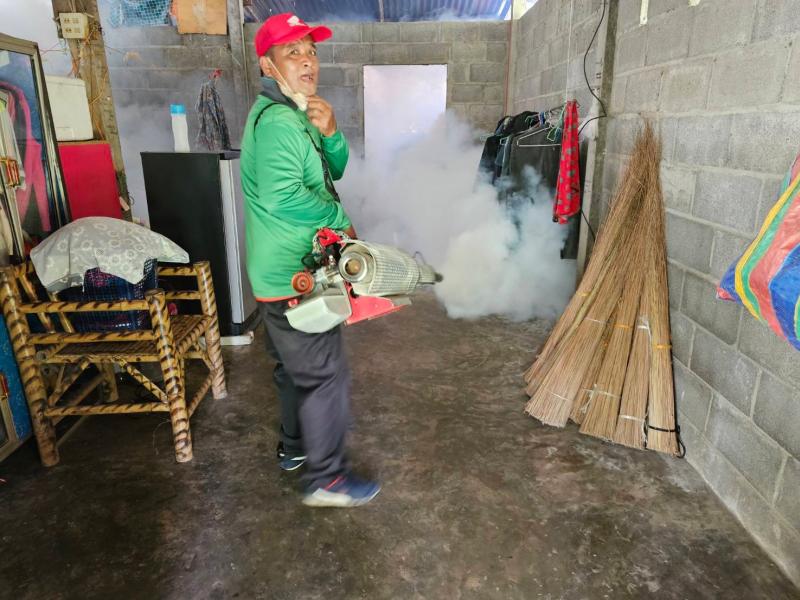 โดยฉีดพ่นหมอกควันกำจัดยุงลายเพื่อป้องกันการระบาดของโรคไข้เลือด พร้อมให้คำแนะนำในการป้องกันโรคที่เกิดจากยุงลายในพื้นที่ ณ หมู่ 7 บ้านสวนสวรรค์