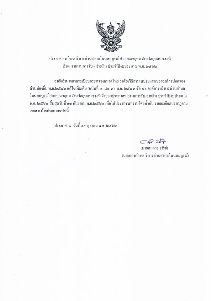 ประกาศ เรื่อง รายงานการรับ - จ่ายเงิน ประจำปีงบปประมาณ พ.ศ.2562