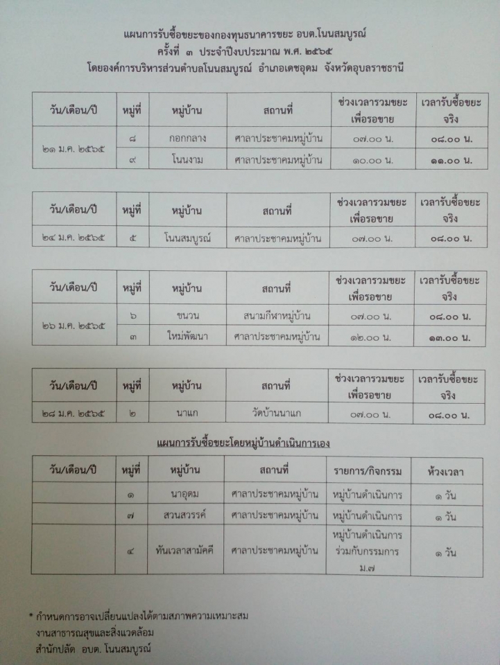 รายละเอียด : แจ้งประชาสัมพันธ์การรับซื้อขยะ ครั้งที่ 3/2565 ของกองทุนธนาคารขยะ อบต.โนนสมบูรณ์