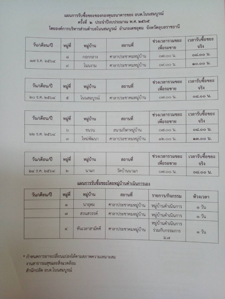 รายละเอียด : แจ้งประชาสัมพันธ์การรับซื้อขยะ ครั้งที่ 2/2565 ของกองทุนธนาคารขยะ อบต.โนนสมบูรณ์