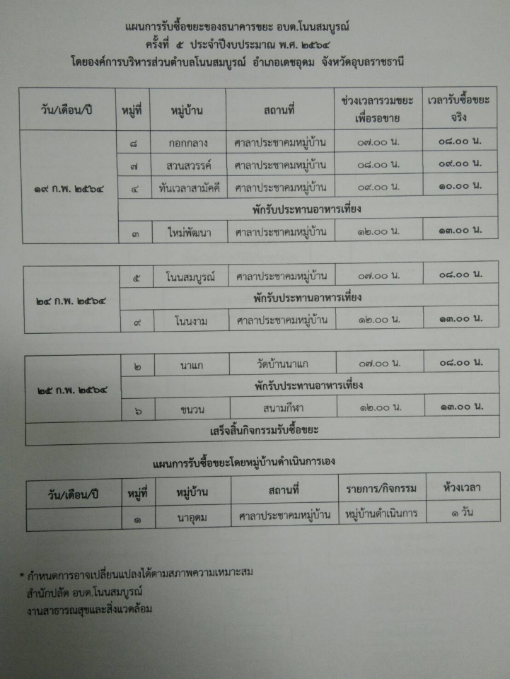 รายละเอียด : แจ้งประชาสัมพันธ์การรับซื้อขยะ ครั้งที่ 5/2564 ของกองทุนธนาคารขยะ อบต.โนนสมบูรณ์