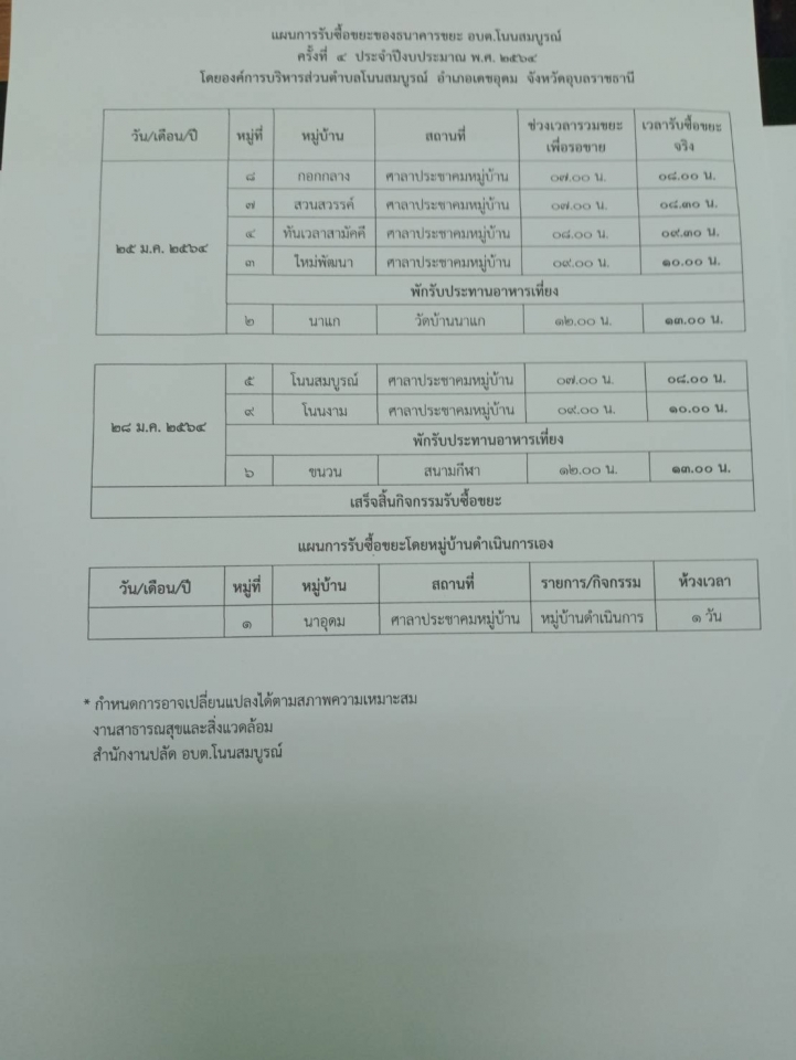 รายละเอียด : แจ้งประชาสัมพันธ์การรับซื้อขยะ ครั้งที่ 4/2564 ของกองทุนธนาคารขยะ อบต.โนนสมบูรณ์