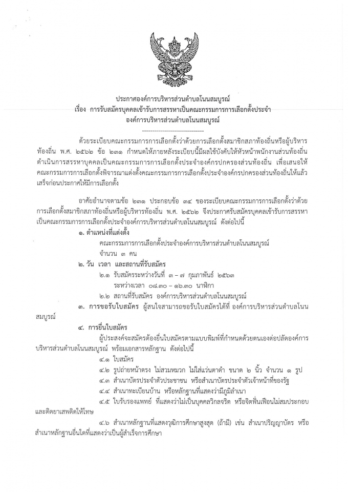 ประกาศ เรื่องการรับสมัครบุคคลเข้ารับการสรรหาเป็นคณะกรรมการการเลือกตั้งประจำองค์การบริหารส่วนตำบลโนนส