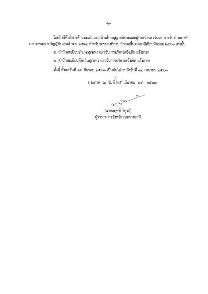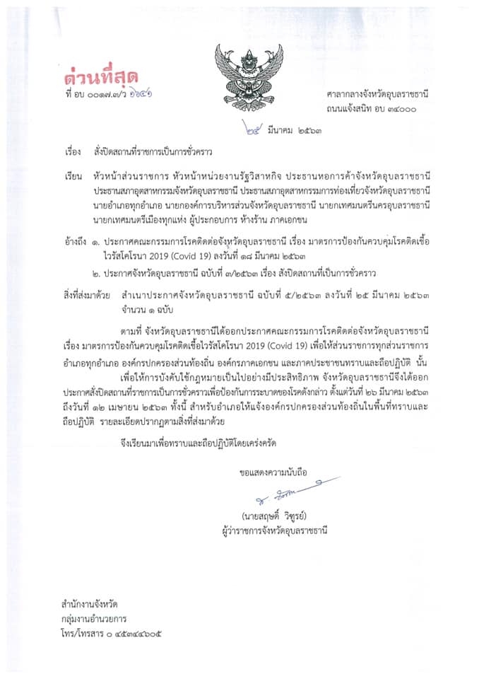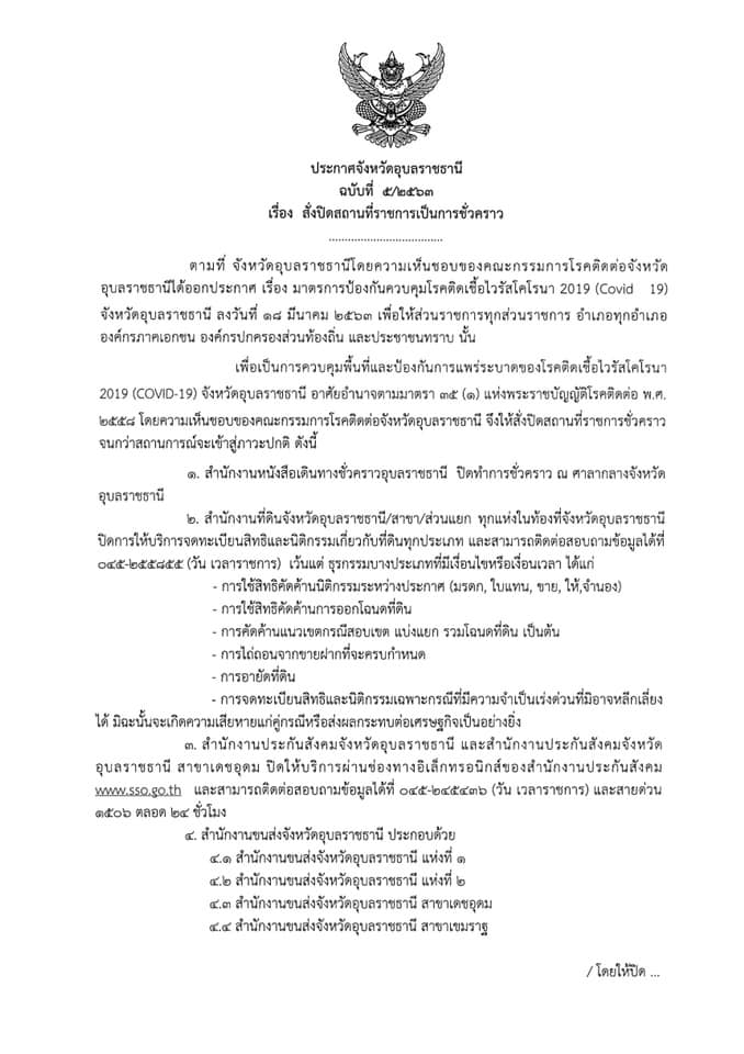 ข่าวประชาสัมพันธ์ ผู้ว่าราชการจังหวัดอุบลราชธานี สั่งปิดสถานที่ราชการเป็นการชั่วคราว