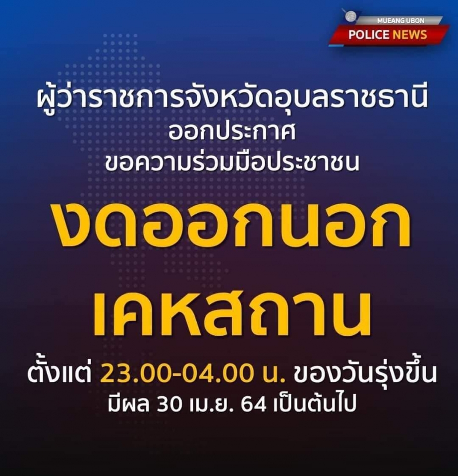 ประกาศ ผู้ว่าราชการจังหวัดอุบลราชธานี เรื่อง ขอความร่วมมือประชาชนงดออกนอกเคหสถาน