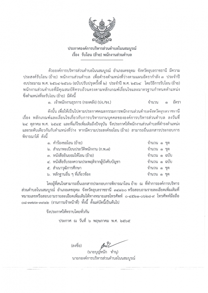ประกาศ เรื่อง รับโอน (ย้าย) พนักงานส่วนตำบล