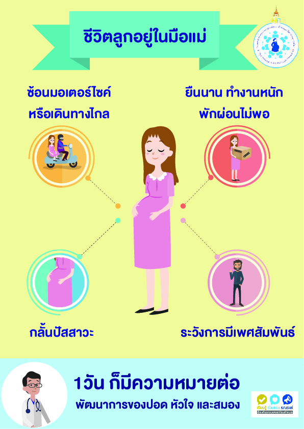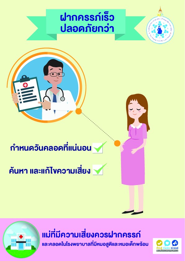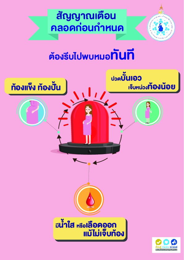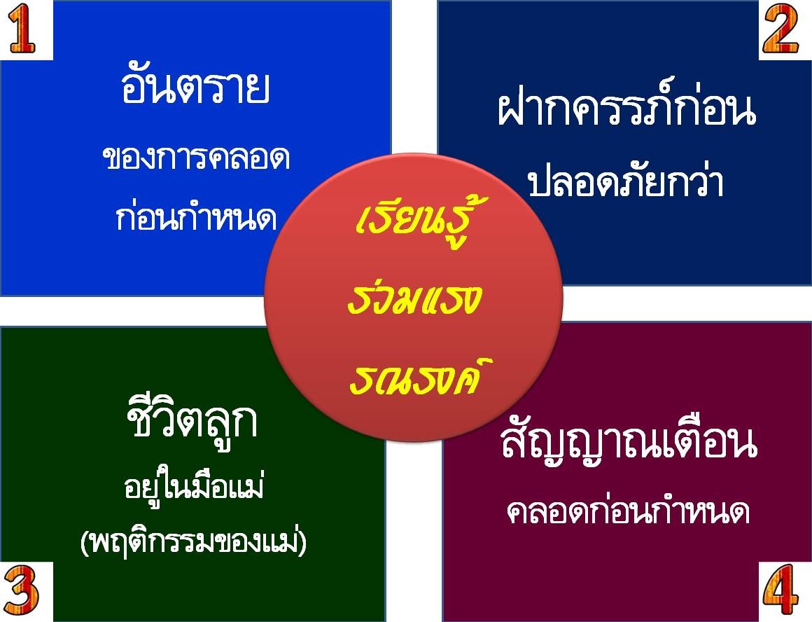 1. อันตรายของการคลอดก่อนกำหนด 2. ฝากครรภ์ก่อนปลอดภัยกว่า 3. ชีวิตลูกอยู่ในมือแม่ (พฤติกรรมของแม่) 4. สัญญาณเตือนคลอดก่อนกำหนด