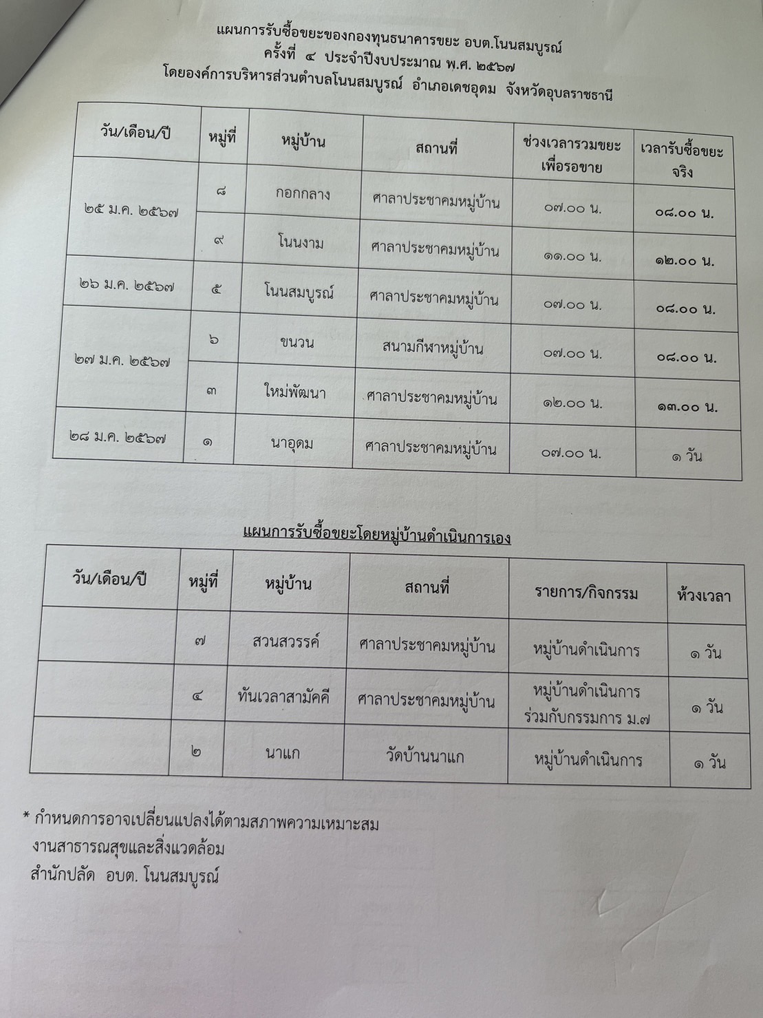 รายละเอียด : แจ้งประชาสัมพันธ์การรับซื้อขยะ ครั้งที่ 4/2567 ของกองทุนธนาคารขยะ อบต.โนนสมบูรณ์