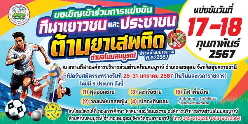 ประชาสัมพันธ์ขอเชิญชวนพี่น้องชาวตำบลโนนสมบูรณ์ ร่วมการแข่งขันกีฬาเยาวชนและประชาชน ต้านยาเสพติด ประจำปีงบประมาณ พ.ศ.2567