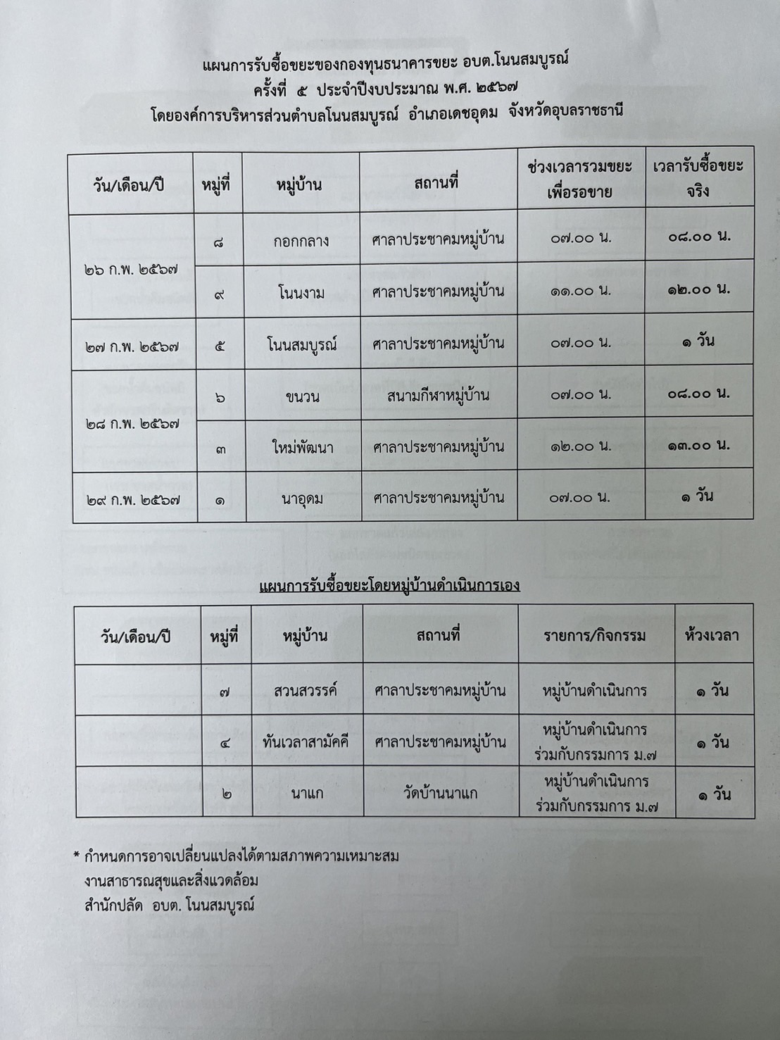รายละเอียด : แจ้งประชาสัมพันธ์การรับซื้อขยะ ครั้งที่ 5/2567 ของกองทุนธนาคารขยะ อบต.โนนสมบูรณ์