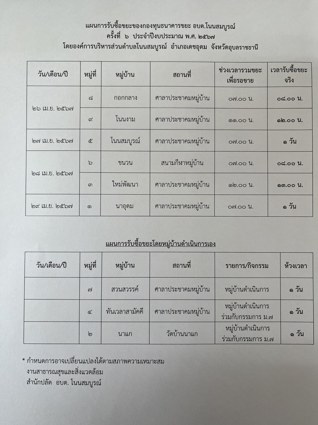 ชื่อเรื่อง : ประชาสัมพันธ์การออกรับซื้อขยะ ตามโครงการธนาคารขยะ อบต.โนนสมบูรณ์ ครั้งที่ 6/2567