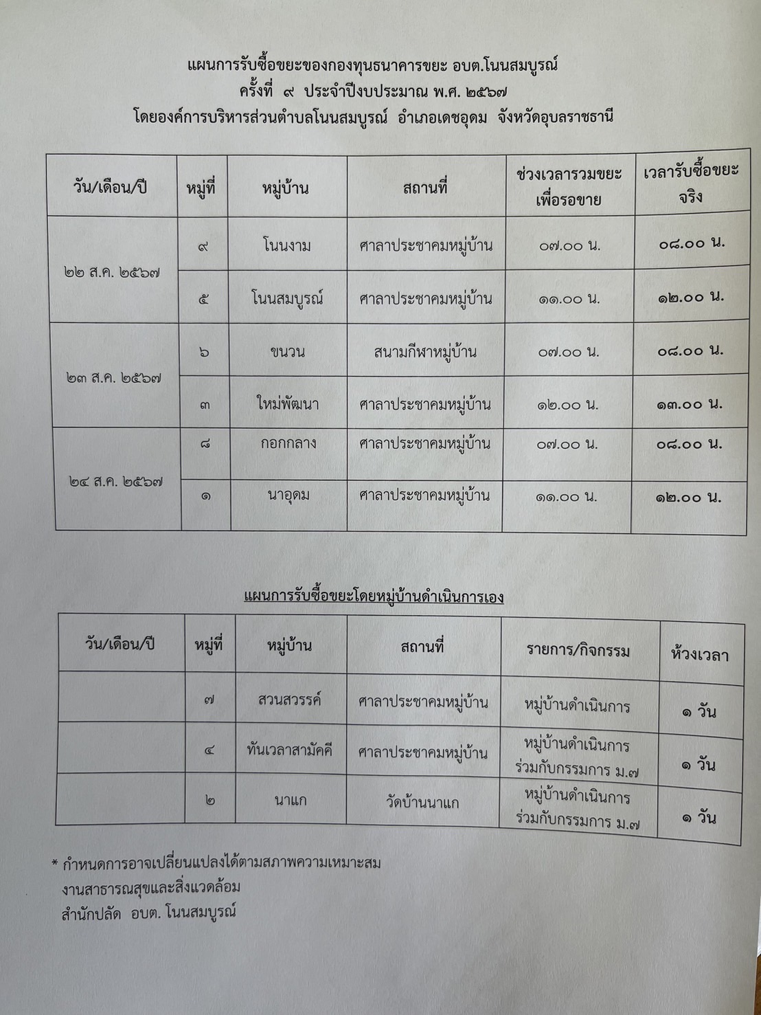 ชื่อเรื่อง : ประชาสัมพันธ์การออกรับซื้อขยะ ตามโครงการธนาคารขยะ อบต.โนนสมบูรณ์ ครั้งที่ 9/2567