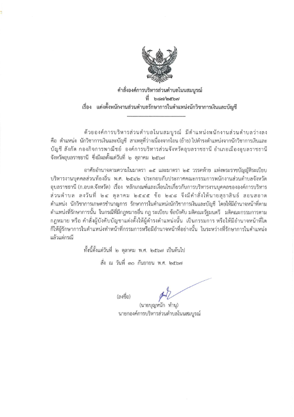 ชื่อเรื่อง : ประกาศ แต่งตั้งพนักงานส่วนตำบลรักษาการในตำแหน่งนักวิชาการเงินและบัญชี