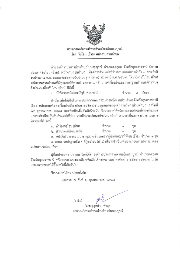 ประกาศองค์การบริหารส่วนตำบลโนนสมบูรณ์ เรื่อง รับโอน(ย้าย)พนักงานส่วนตำบล
