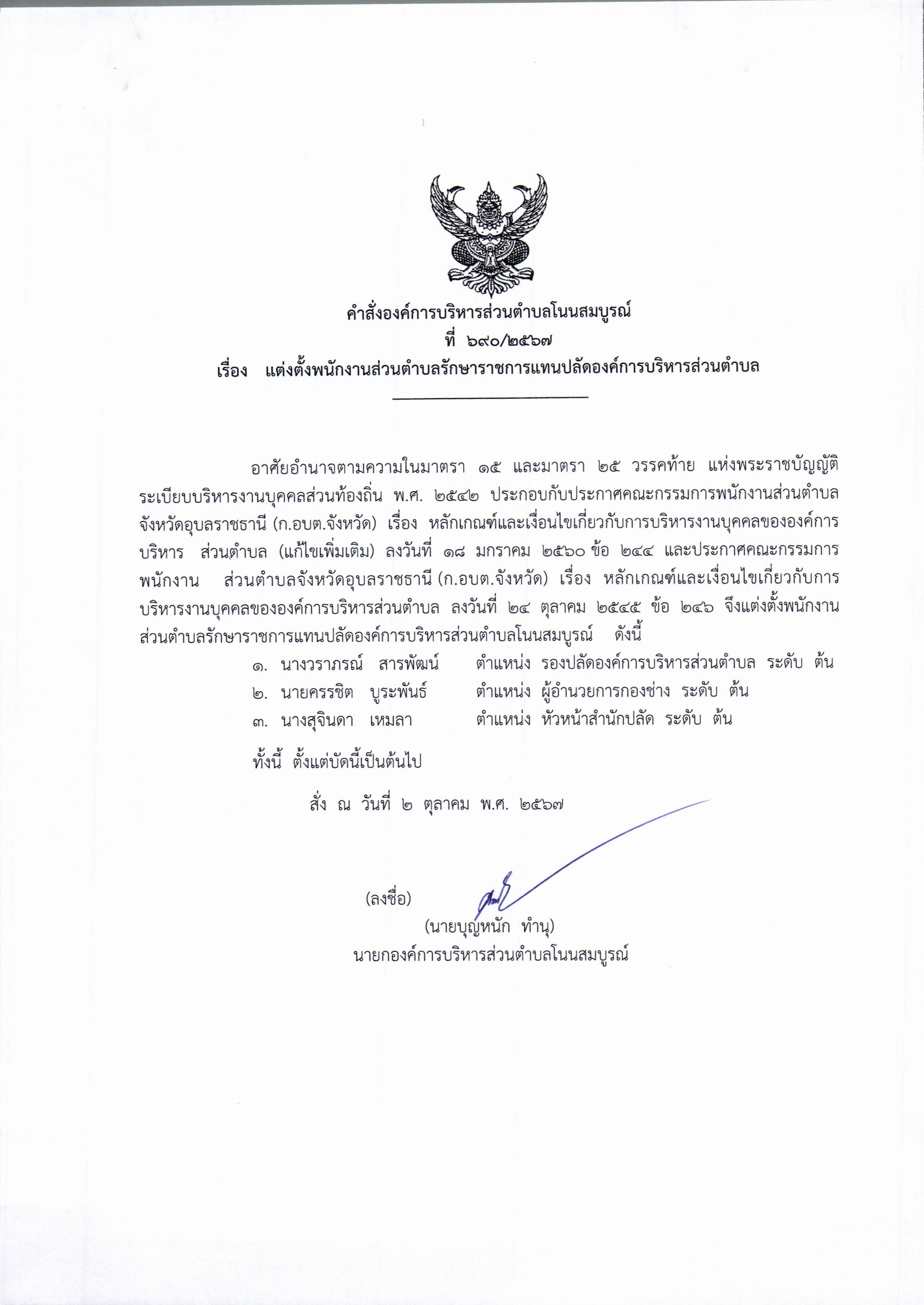 คำสั่ง แต่งตั้งพนักงานส่วนตำบลรักษาราชการแทนปลัดองค์การบริการส่วนตำบล