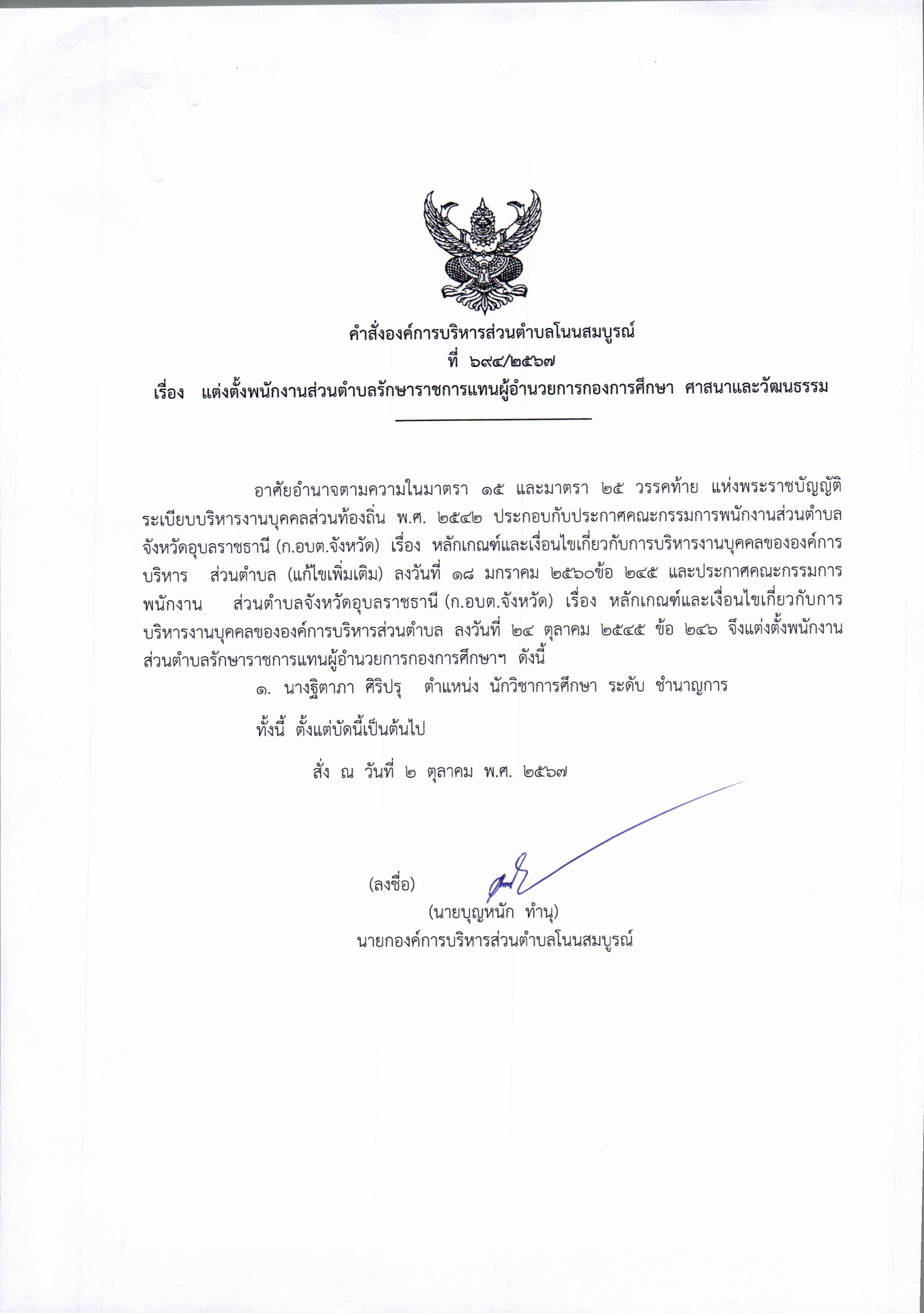 คำสั่ง แต่งตั้งพนักงานส่วนตำบลรักษาราชการแทนผู้อำนวยการกองการศึกษา ศาสนาและวัฒนธรรม
