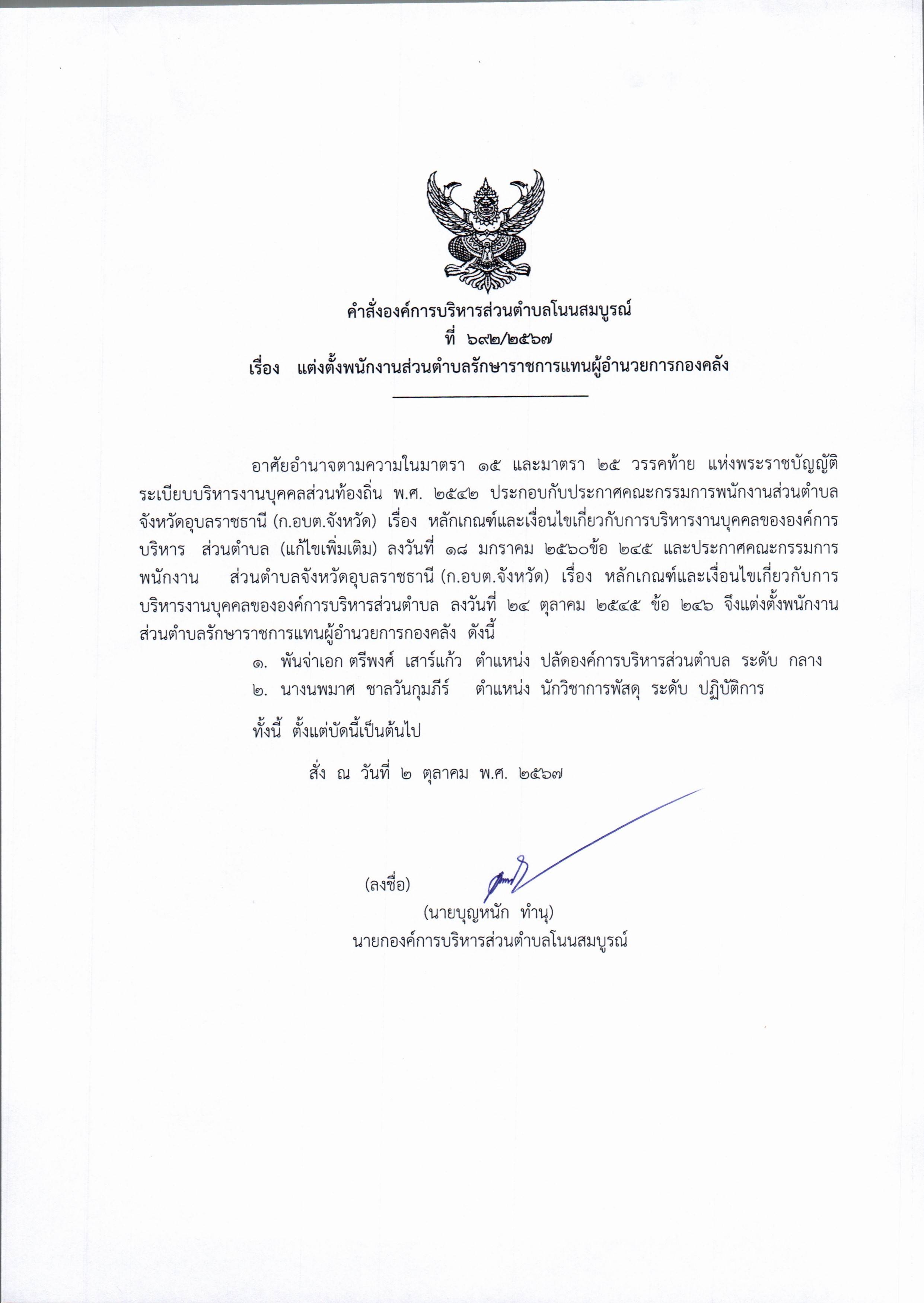คำสั่ง แต่งตั้งพนักงานส่วนตำบลรักษาราชการแทนผู้อำนวยการกองคลัง