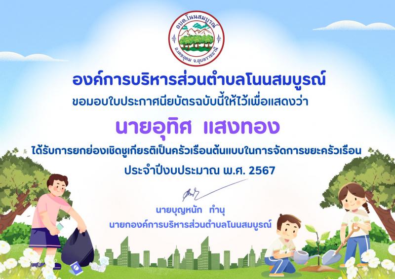 องค์การบริหารส่วนตำบลโนนสมบูรณ์ประชาสัมพันธ์ประกาศการยกย่องเชิดชูเกียรติครัวเรือนต้นแบบในการจัดการขยะครัวเรือน2567 ได้แก่นายอุทิศ แสงทอง