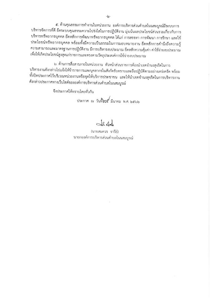 การประกาศเจตจำนงการบริหารงานด้วยความสุจริต ตามประกาศองค์การบริหารส่วนตำบลโนนสมบูรณ์ เรื่อง นโยบายและ