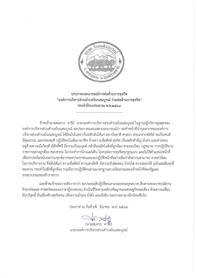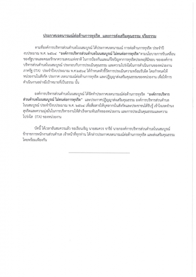 ประกาศเจตจำนงสุจริตด้านคุณธรรมและความโปร่งใสในการทำงาน ประจำปี 2564