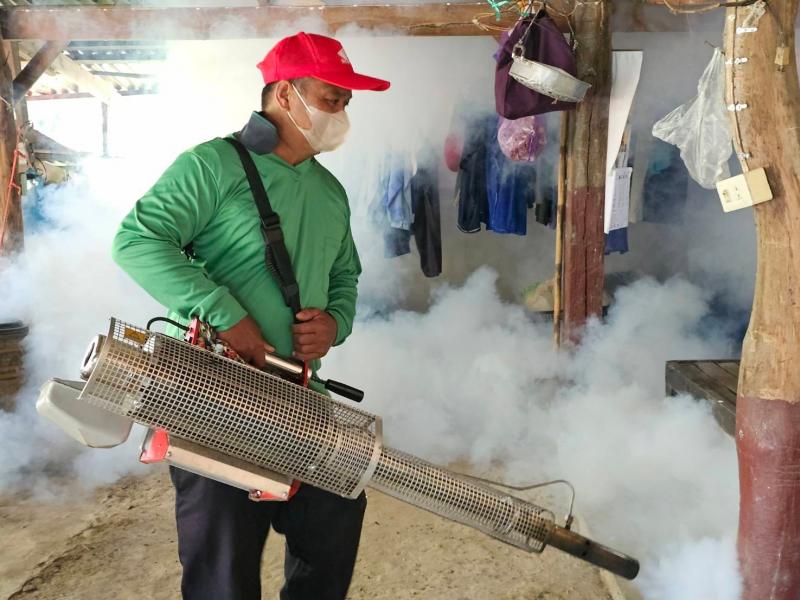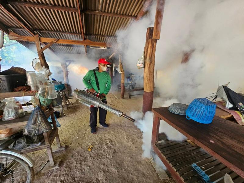 โดยฉีดพ่นหมอกควันกำจัดยุงลายเพื่อป้องกันการระบาดของโรคไข้เลือด พร้อมให้คำแนะนำในการป้องกันโรคที่เกิดจากยุงลายในพื้นที่ ณ หมู่ 7 บ้านสวนสวรรค์